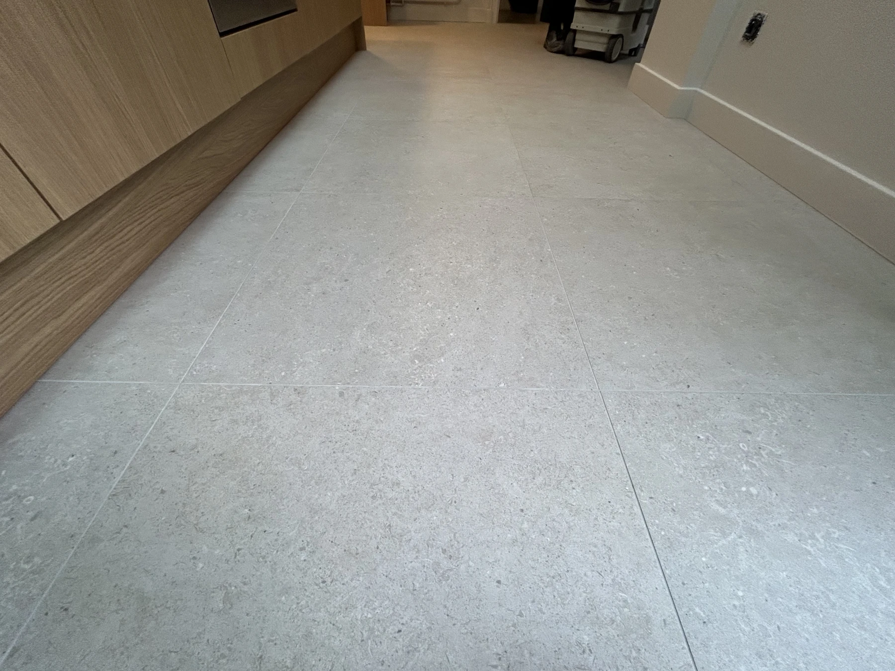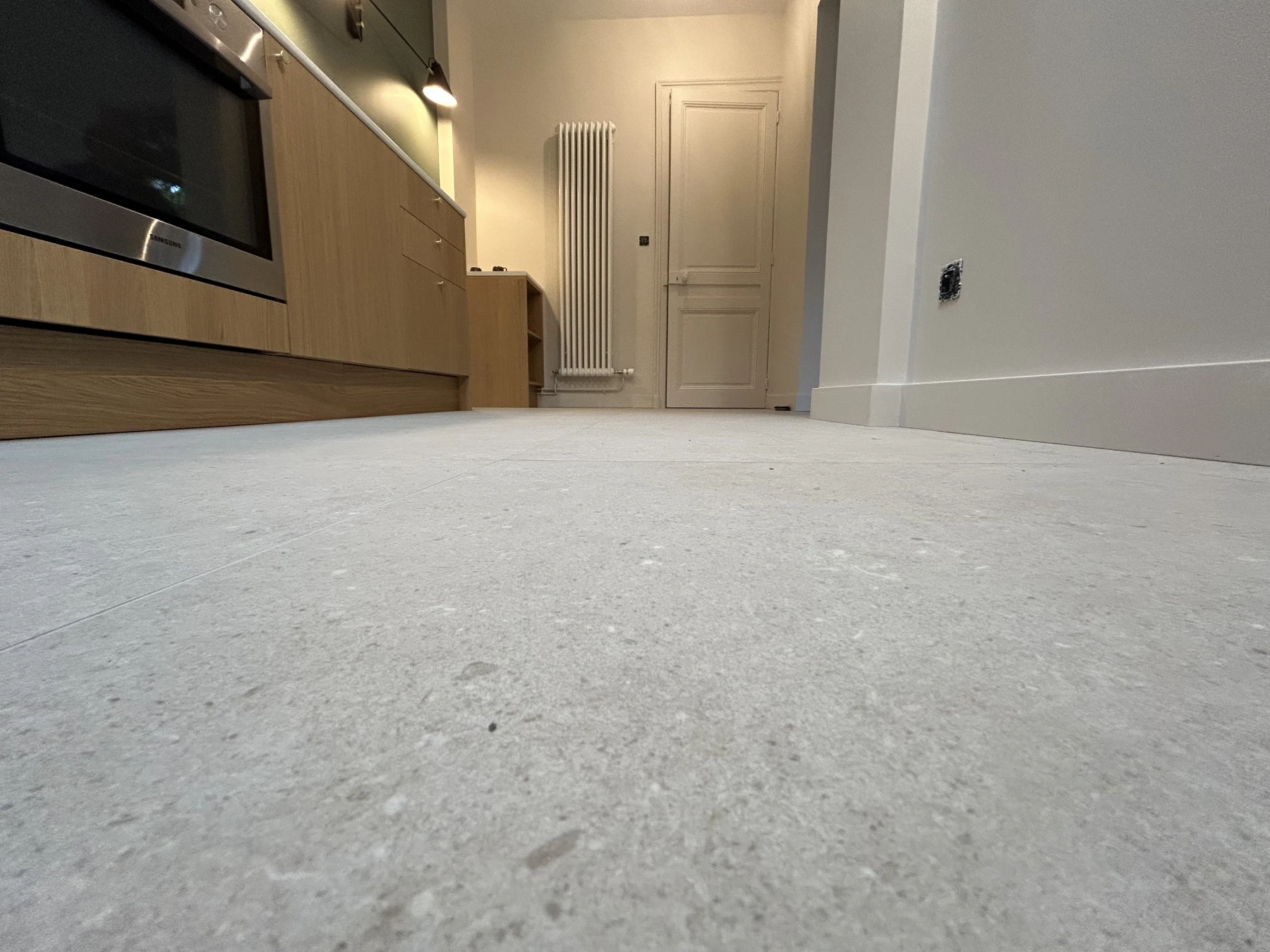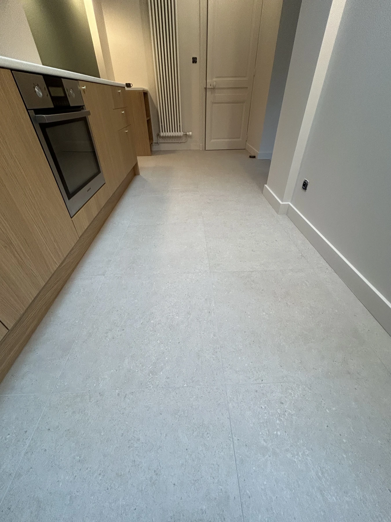 Sur ce projet de rénovation globale d'une cuisine et d'un coin repas, remplacement du sol ( ancienne tomette) par un grand format aspect pierre .